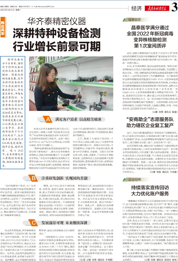 特種設備安全十分重要,國家對于特種設備檢測的次數及頻率增加。隨著經濟的快速發展,近年來特種設備檢測行業在我國的發展速度驚人,市場需求增長,市場發展前景較好。太連華齊泰精密儀器有限公司始終以國內特檢行業迫切需求為導向,堅持走務實創新可持續發展之路,以此提高企業核心競爭力。在國內外經濟下行壓力大的當下,企業每年營業額仍以10%的速度遞增穩中求進,穩步向前。進入2022年,企業將激發深入骨髓的創新基因,揚帆遠航再出發。